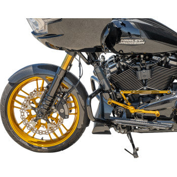 - Integrated "No Flex" fork brace flows seamlessly with the lines of the fork legs while adding stability and rigidity to the front end