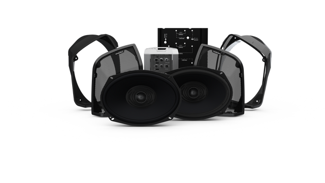 The Road King kits are designed to deliver an exceptional sound experience while retaining as much interior bag space as possible. The 6x9 inch bag lid speakers install seamlessly into the top of the factory saddlebags using the included cutting template, waterproof bag lid mounts, and speaker grilles. The speakers are connected to a 400-watt amplifier that’s mounted to a custom plate inside the rear of the bag. The system is tied together via a plug-and-play wiring harness and included Bluetooth® receiver. The rider simply connects a smartphone via Bluetooth® and you’re ready to ride. The entire system is Element Ready® to withstand rain, dirt, and dust in the riding environment. The speakers are also highly efficient and tuned to overcome wind, exhaust and road noise.